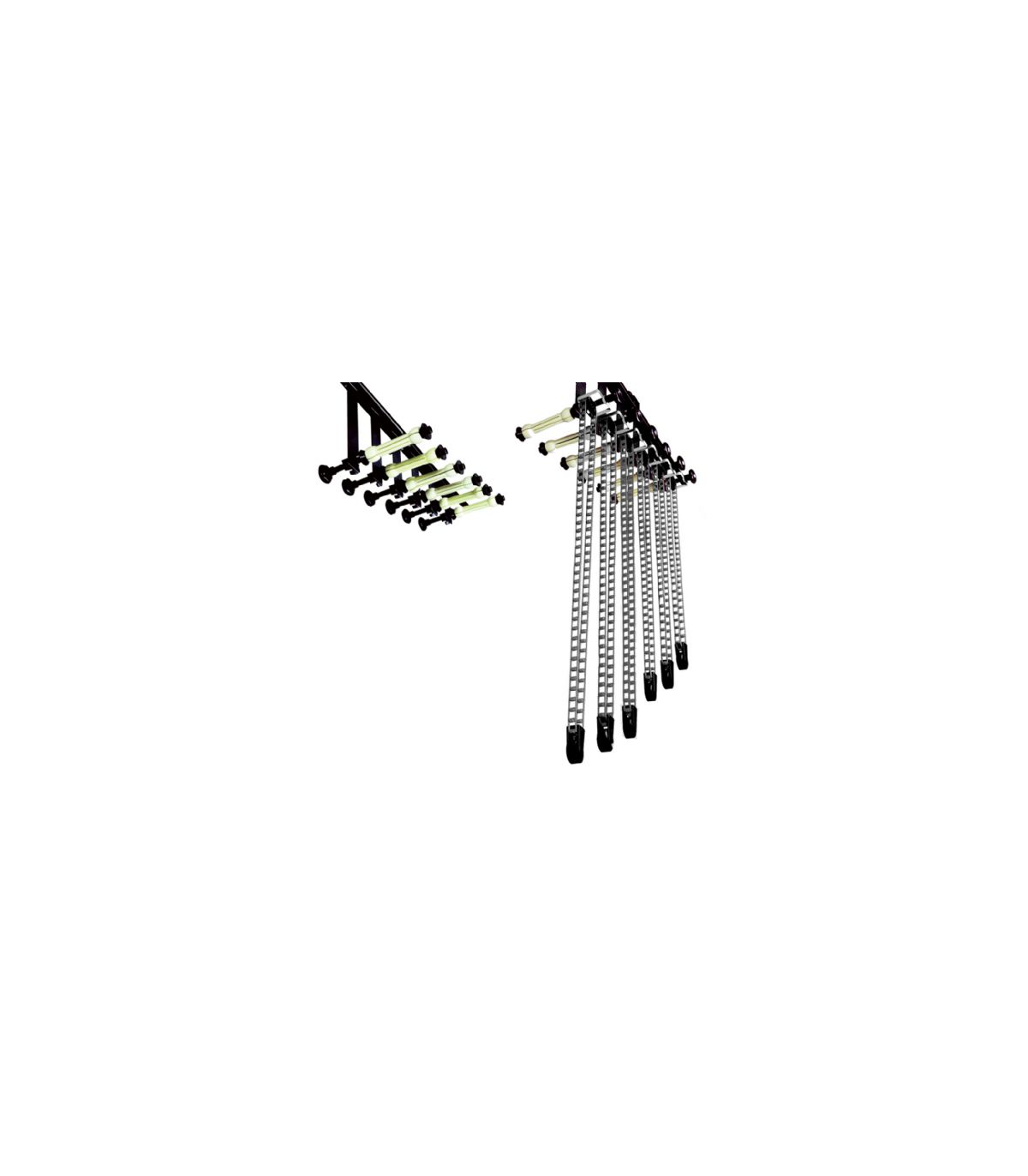 The StudioKing MBG-2006 Background Support is a universal hanging system used to hang up to six backgrounds. The system can easily be fixed to the wall or ceiling. The holder is easiy attachable to a wall or ceiling. Once placed on the holder, the background roll can be secured by fastening the holder causing the clamps to expand and in turn, ensuring the background roll is secured. The supplied guides ensure the chains stay in place while the chains allow the user the easily roll the background paper up and down.