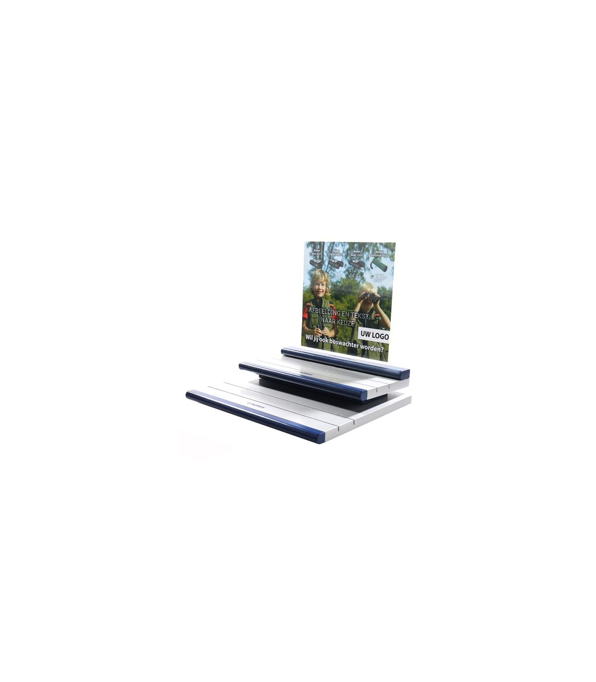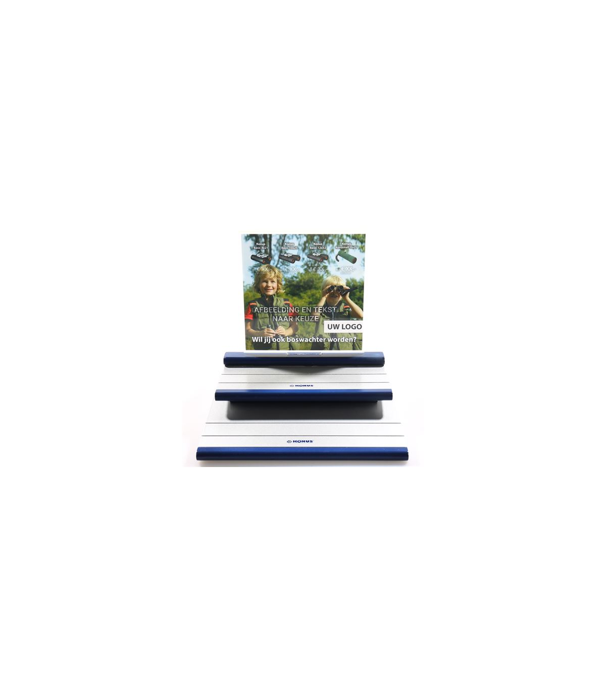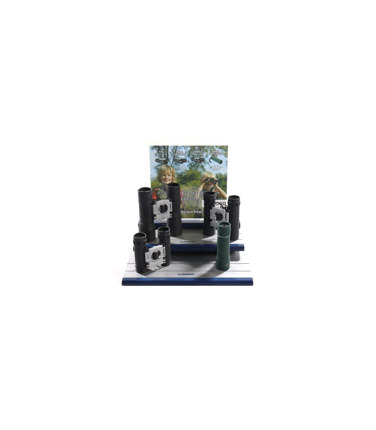 This set consists of 20 binoculars and a binocular display with personalized features. Four different binoculars are supplied, which you can mount on the binoculars display. On the display is a photo of your choice, with your own logo and your chosen sales prices. An extra low purchase price makes it possible to make a nice margin on the binoculars. After ordering we will contact you to discuss your wishes.