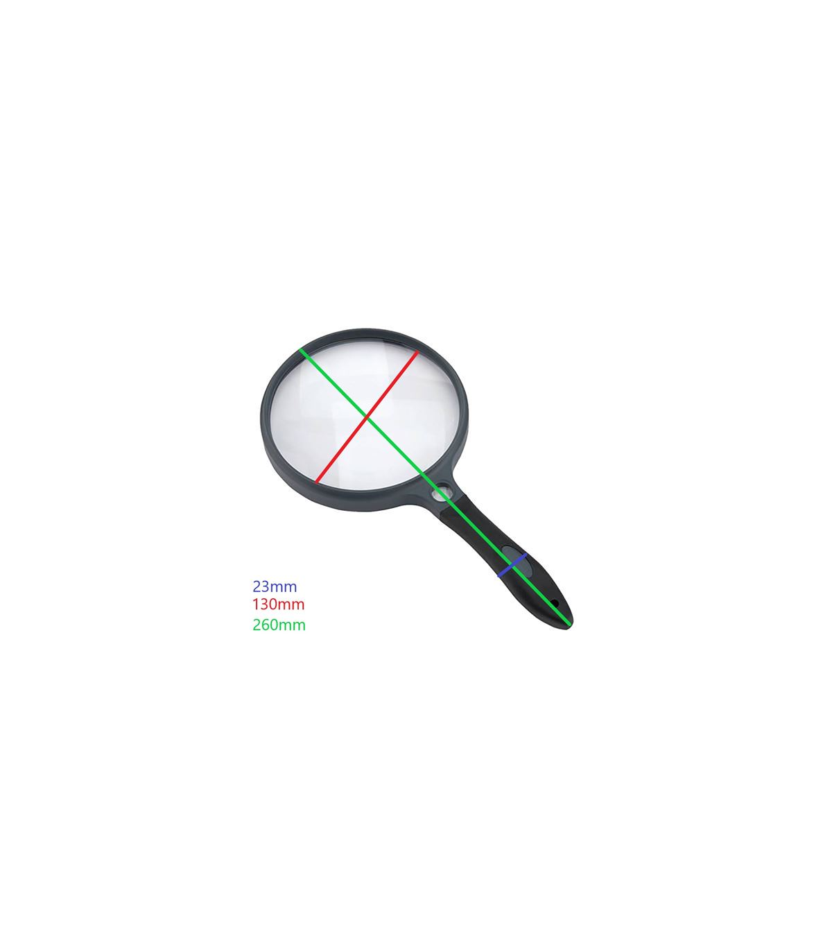 This universal magnifying glass has a 2x magnification and has a built-in power lens with an 11.5x magnification. This spot lens is located at the top of the handle. The magnifying glass has a lens diameter of 130mm. For high-comfort purposes, the handle has a rubber grip. The lens is made of high quality glass, the spot lens is made of acrylic. This gives you an extremely clear image and a high scratch resistance. To make it safe and easy to carry, a compact carrying pouch with drawstring is included.