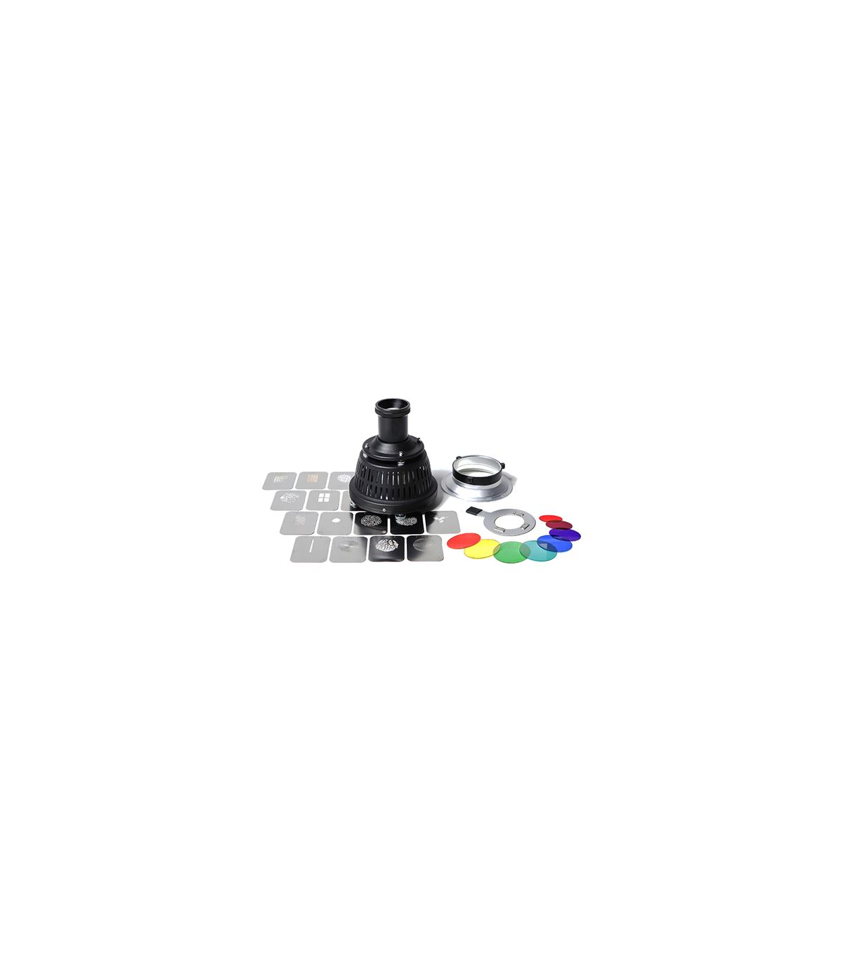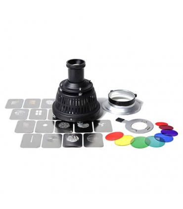 Attach the FTA-OS3 to your flash or LED light with the supplied Bowens mount. The adapter ring is interchangeable, so you can also use the FTA-OS3 with lamps from, for example, Falcon Eyes. You will find all suitable adapter rings with the optional accessories. There are 6 different colour filters included with the FTA-OS3, which makes it possible to combine all colours with all shapes.